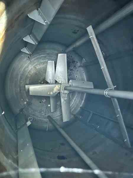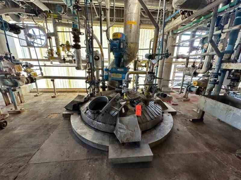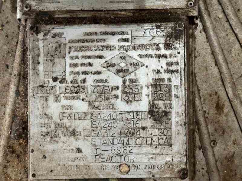 Used 2000 gallon 316 stainless steel reactor. Manufactured by Fabricated Products. Shell rated 75FV @365F, 304 SS jacket rated 150psi @365F. 78" dia x 90" tall. Half pipe jacket, top mounted agitation, (4) Internal Sidewall Baffles, Dished Top & Bottom. National Board #766. Serial #6026. Built 1986.