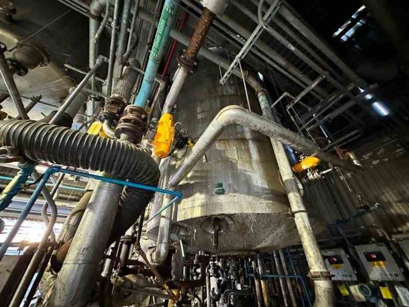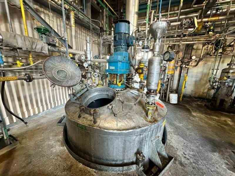 Used 3500 gallon 316 stainless steel reactor. Manufactured by Wolfe. Shell rated 150FV @475F, 304SS jacket rated 150FV @475F. 84" dia x 144" tall. Half pipe jacket. Top Mounted Agitation, (4) Internal Sidewall Baffles, Dished Top & Bottom. National Board #759, serial #C-1945. Built 2002.
