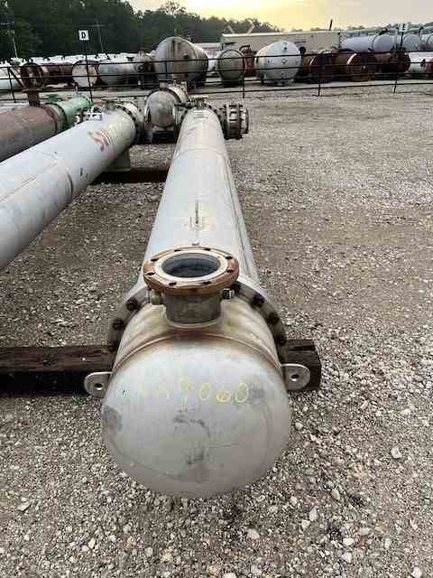 Used 1089 sq ft stainless steel shell and tube heat exchanger. Manufactured by Hoffman Process. 304L SS shell rated 150psi @450F. (231) 1" 316L SS tubes rated 150psi @150F. National Board #806. Serial #3185A. Built 2000.