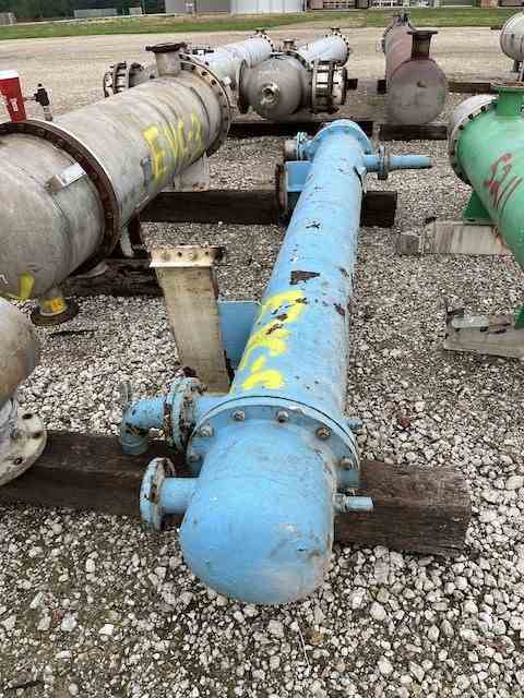 Used 223 sq ft 316 stainless steel shell and tube heat exchanger. Manufactured by Doyle & Roth. 14" OD x 24'OAL. Carbon steel shell rated 150psi @375F. (85) 1" 316SS tubes rated 150psi@ 450F. Built 1979. Weight 1700 lbs.