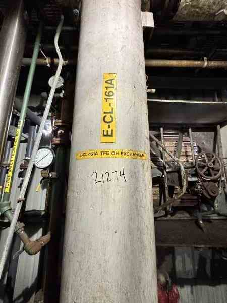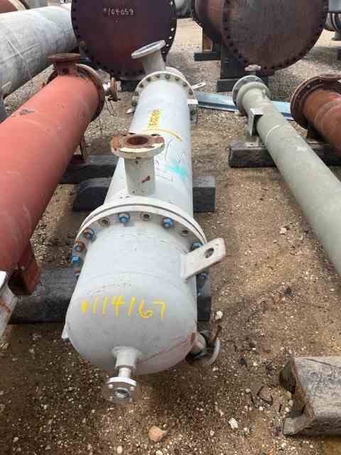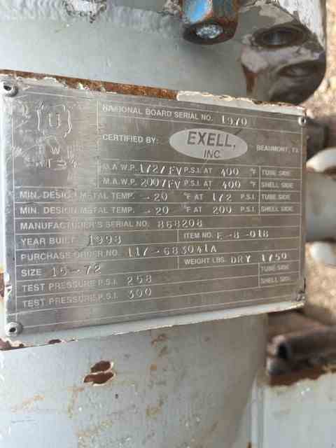 Used 160 sq ft 316 stainless steel shell and and tube heat exchanger. Manufactured by Exell Inc. 16" OD x 9' OAL. SA 106-B shell rated 200 psi @400F, (143) 3/4" OD 316 stainless steel tubes rated 172 psi @400F. National Board #1970, serial #868208. Weight 1750 lbs. Built 1998.