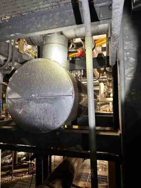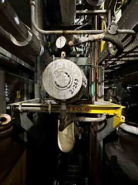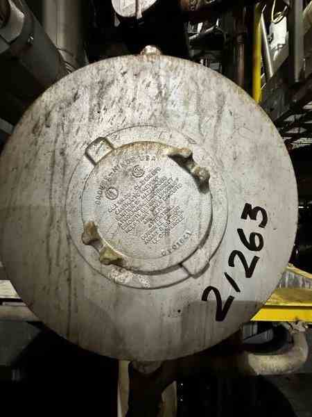 Used 13400 lbs/hr hot oil electric circulation heater. Manufactured by Caloritech. Model #EX124643F861MXY. Rated 360 psi @800F. 480V/60Hz/3Phase, (24) Heating elements with control panel. 15" OD X 87" Length. Using Syntherim 800 heat transfer fluid. 2" inlet and outlet nozzles. Built 1998.