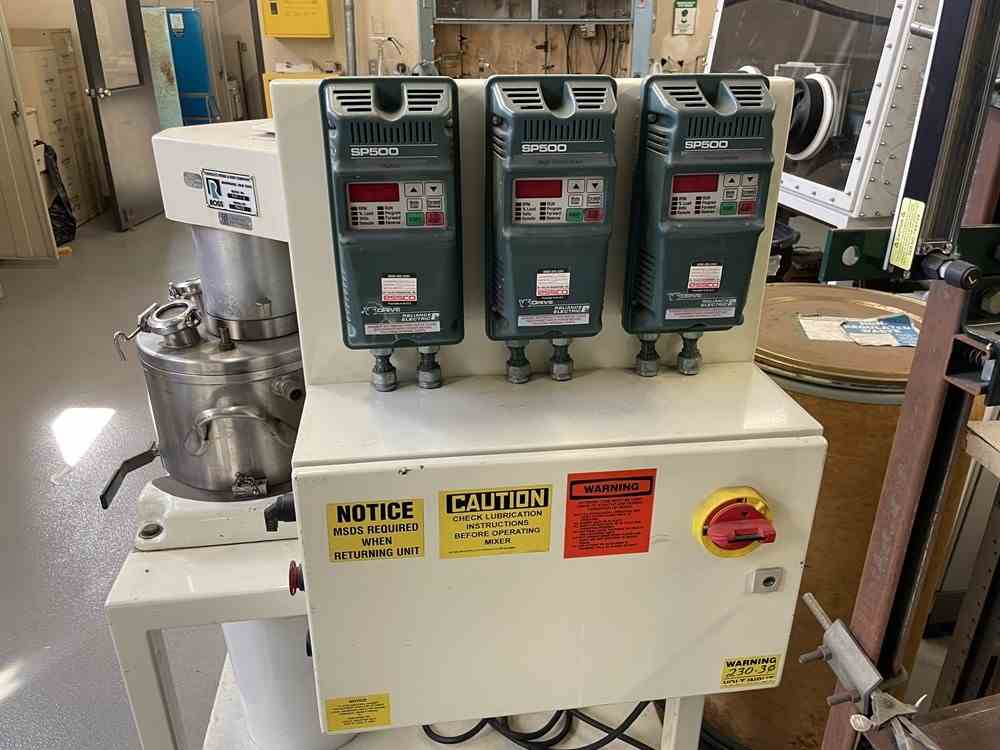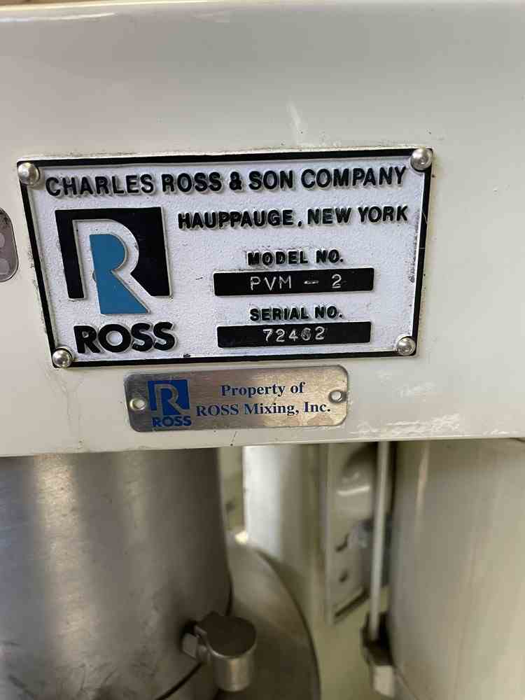 Used 2 gallon Stainless Steel Triple shaft Mixer. Manufactured by Ross. Model PVM-2. Anchor agitator, high shear rotor/stator mixer and a high-speed disperser. .75HP motor. Serial #72462.