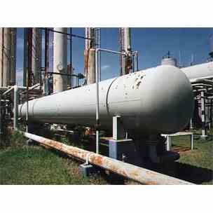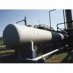 Used 7,500 gallon Horizontal CS Pressure Tank. Internal rated 333 PSI @ 150 Deg F. 5' Dia x 50' T/T. (OAL: 53'). Dished heads. Shell thickness: 3/4". Head thickness: .9/16". Nozzles: 16" Manway, (2) 6", 4", (2) 2", (8) 1-1/2", (2) 3/4", 1/2". Mounted on welded saddles. ASME/ API coded. Built by General Welding, 1954. Good condition. Weight: Approx 32,500 lbs.