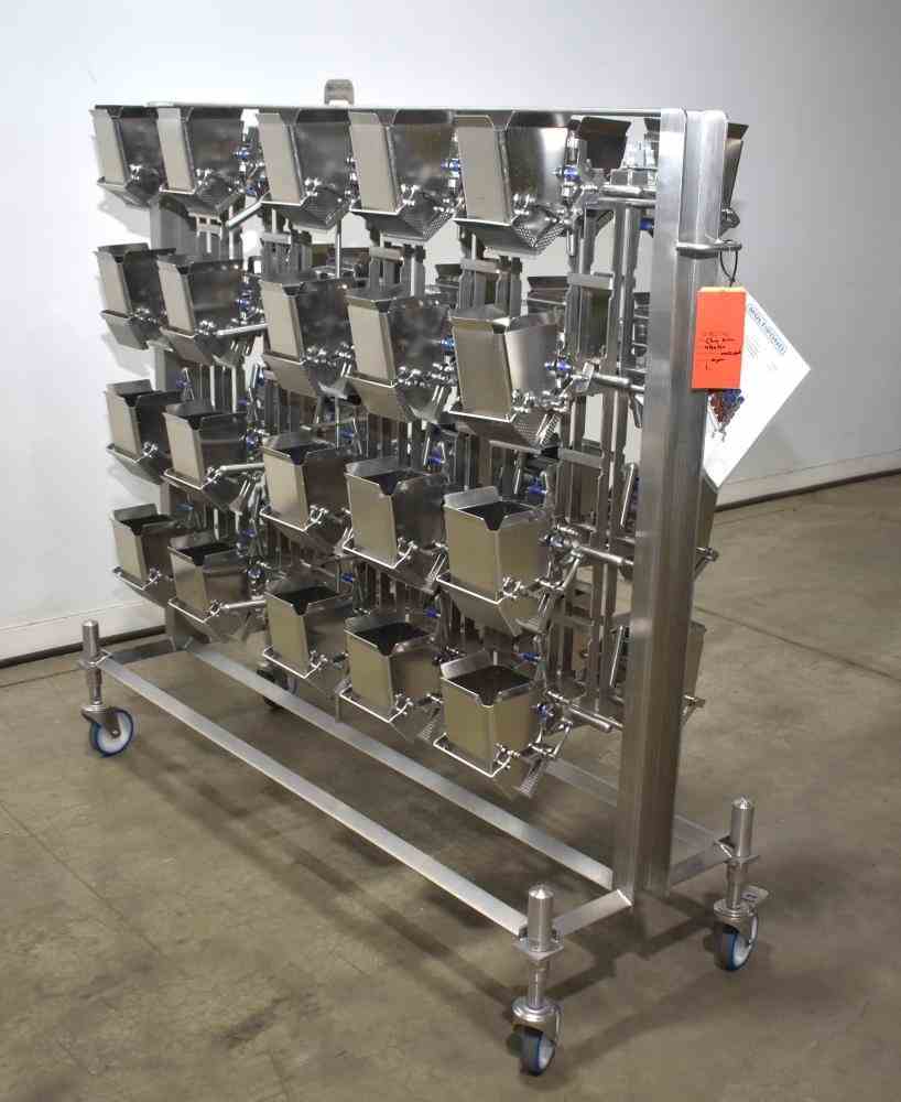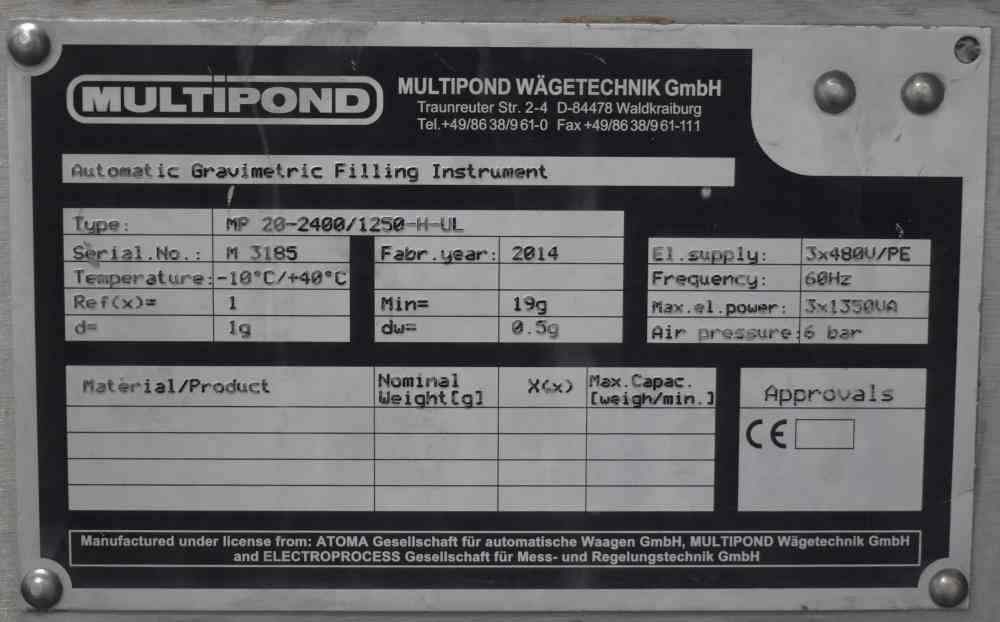 Used Multipond MP20-2400/1250-H-UL 20 Head Rotary Combination Mixing Scale with Embossed/Dimpled Buckets. Capable of speeds up to 200 weighings per minute (depending on weight and application). Capable of mixing up to 4 products. Weight range up to 3000 grams per dump. Last ran in cheese operation. 3/60/480V. Equipped with 2.4L buckets.