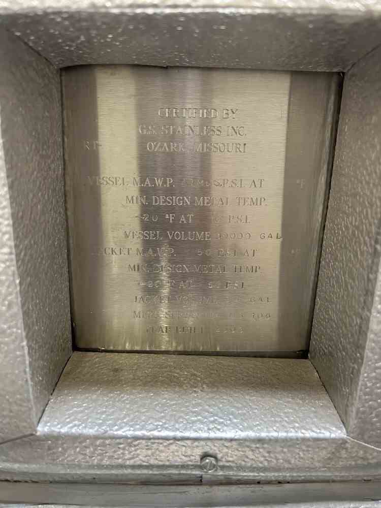 Used 10000 gallon Stainless Steel jacketed tank. Manufactured by GS Stainless Inc. Jacket MAWP 50 PSI. Side oval manway. Dome top, dish bottom. (6) Leg mounted. U-Stamp. Serial #MS106. Built 2003.