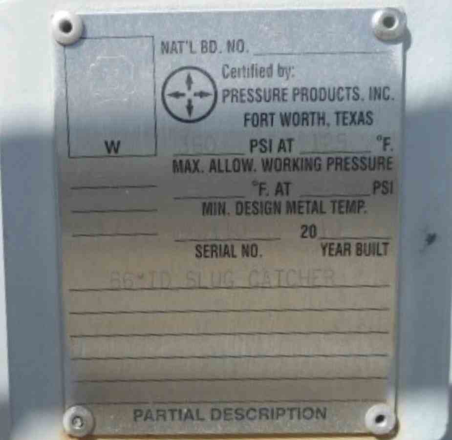 Used 9000 gallon carbon steel horizontal pressure vessel. Manufactured by Pressure Products. 66" ID x 50' Length. Rated 325 psi @125F. Asmed Sec 8 coded, National Board #3577. Serial #113918. Built 2010. Dismantled and ready for shipment. Previous use: Slug Catcher.