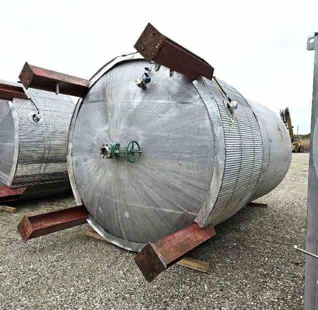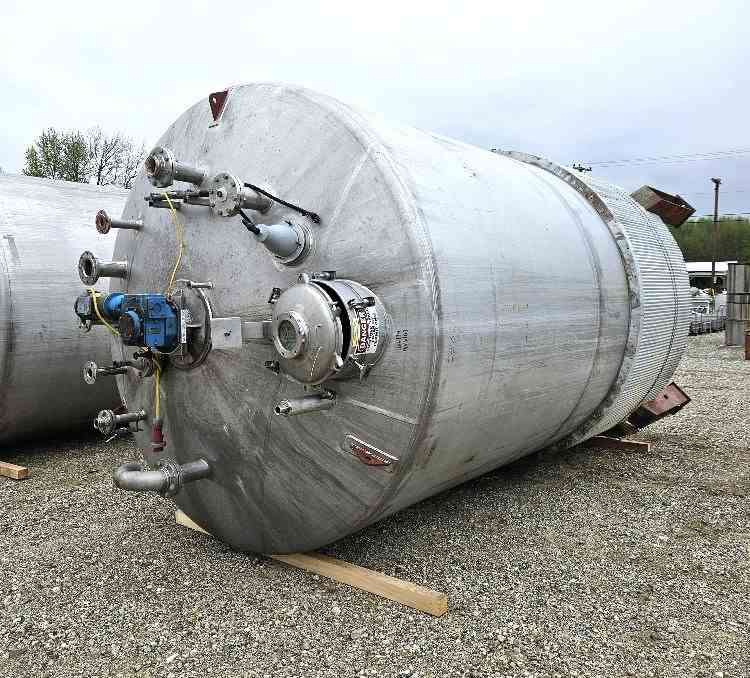 Used 10000 Gallon Jacketed 316 Stainless Steel Dish Bottom Mix Tank. 10' Dia. X 16' T/T (22'9" Overall Height). Half Pipe Stainless Steel Jacket. Has dish top with 2 HP, 208-230/460 volt Chemineer Mixer with 44 RPM output speed. 4" Center Bottom Outlet. Mounted on legs. Approx. 24" from bottom flange to floor (20" with valve and flange). Last used in sanitary Health/Nutritional/Biomedical Collagen products. (2) available.