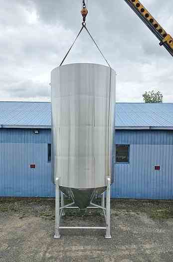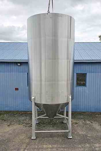 Unused 10000 gallon 304 Stainless Steel tank. 118"OD x 192'Straight side. 24'3" OAH. 55" cone with 12" center discharge reduced to 3" Tri-clamp. 24" Top manway. (4) Leg mounted with pads. 6000 Lb.
