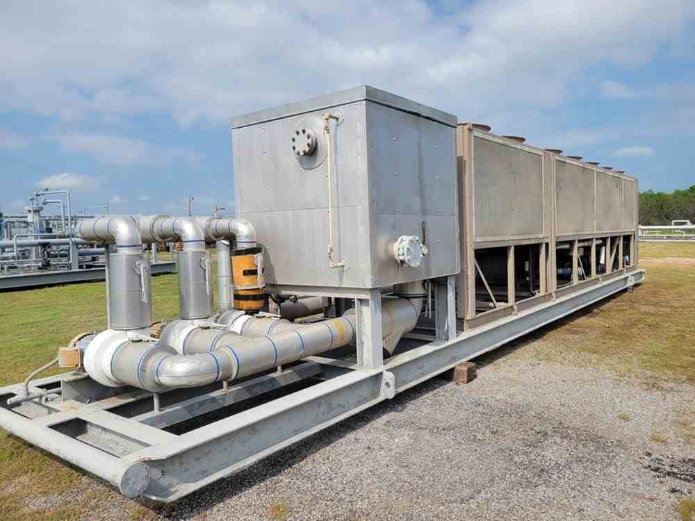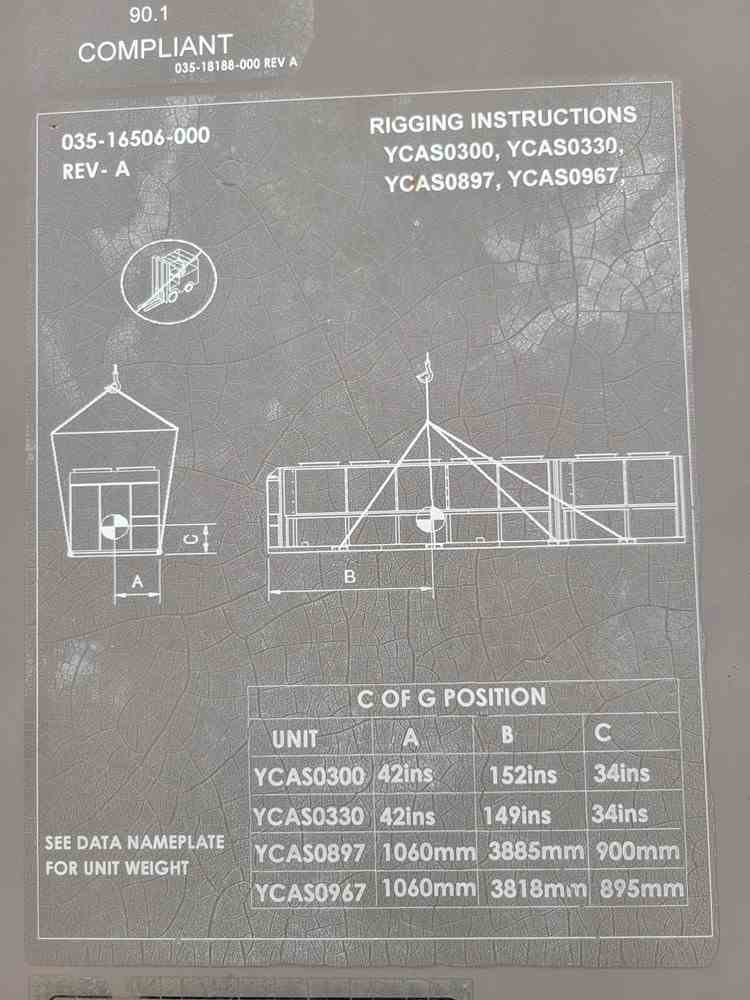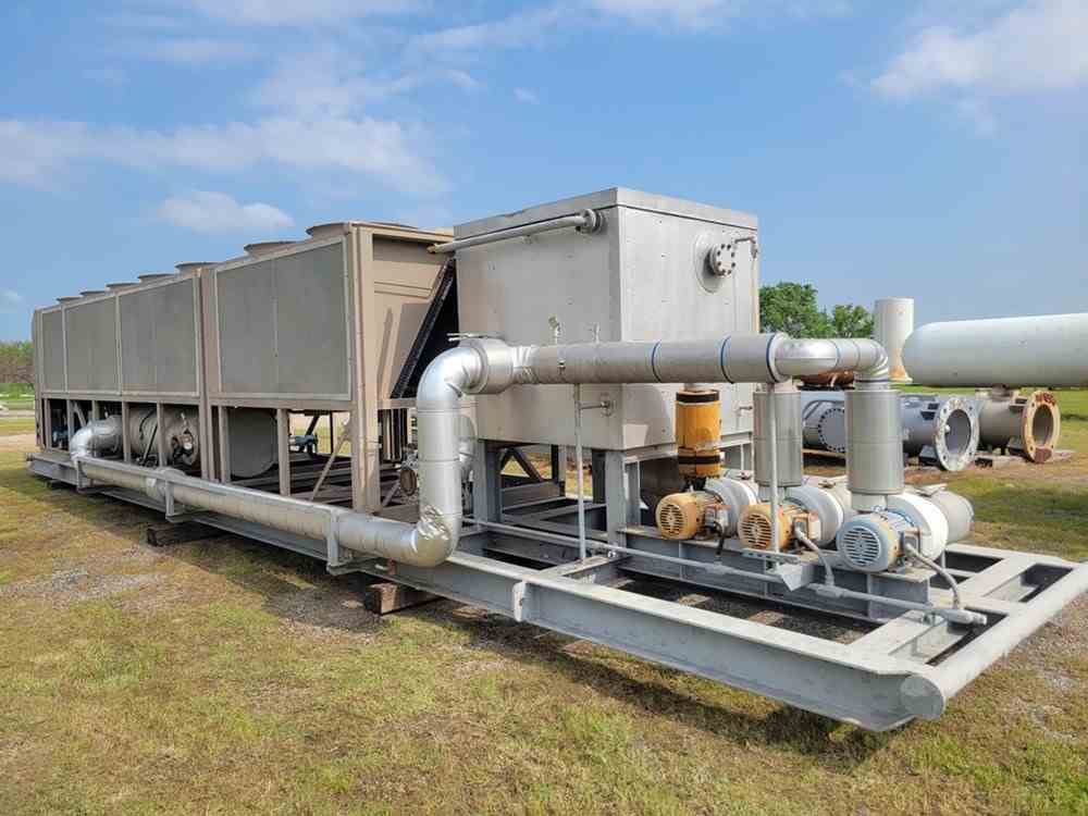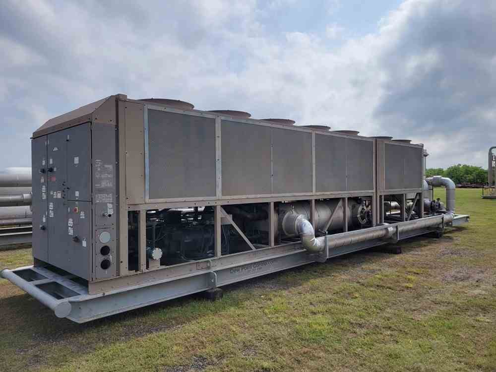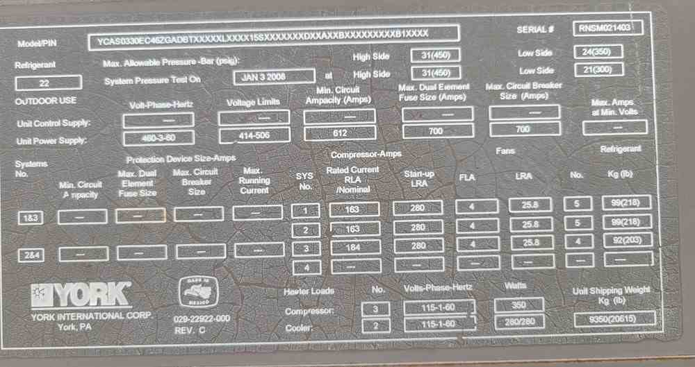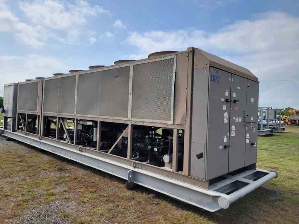 Used 330 Ton chiller skid. Manufactured by York. Model YCAS0330. 7.5HP motor. R-22 refrigerant. Skid mounted. Overall 48'L x 9'H x 9'W. 40000 lbs. Serial #RNSM021403. Built 2008.