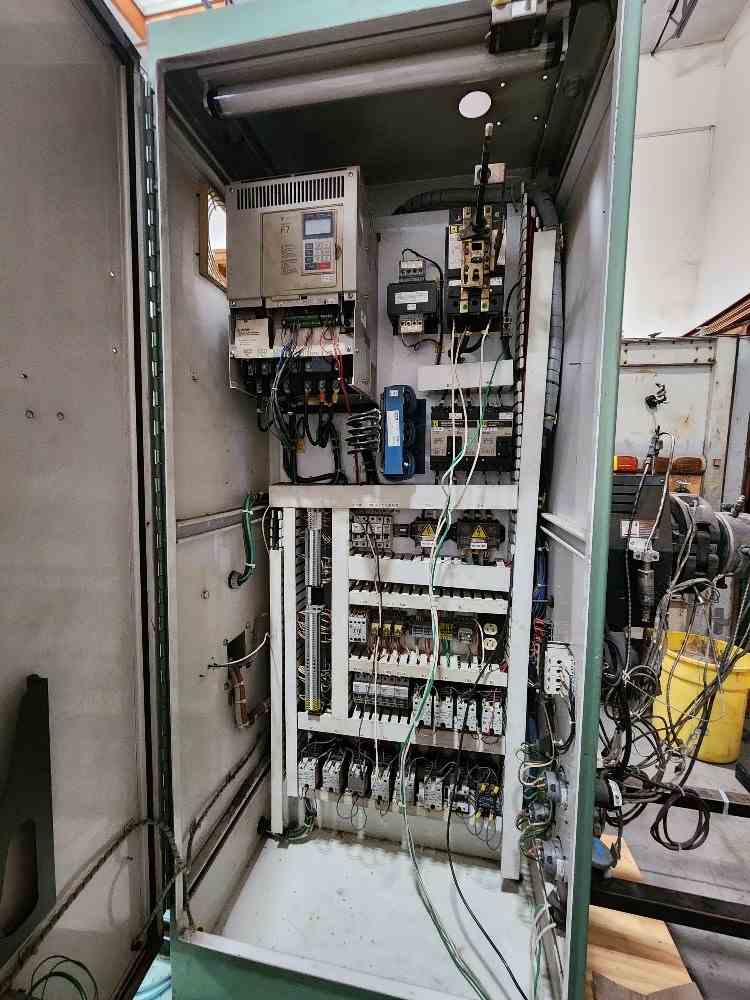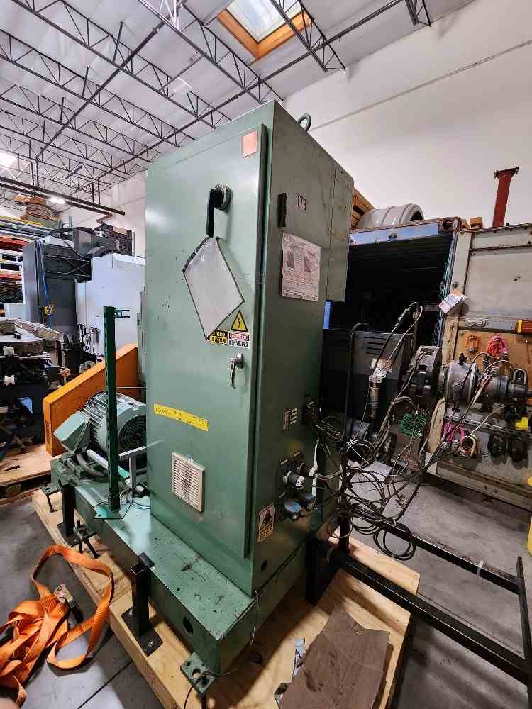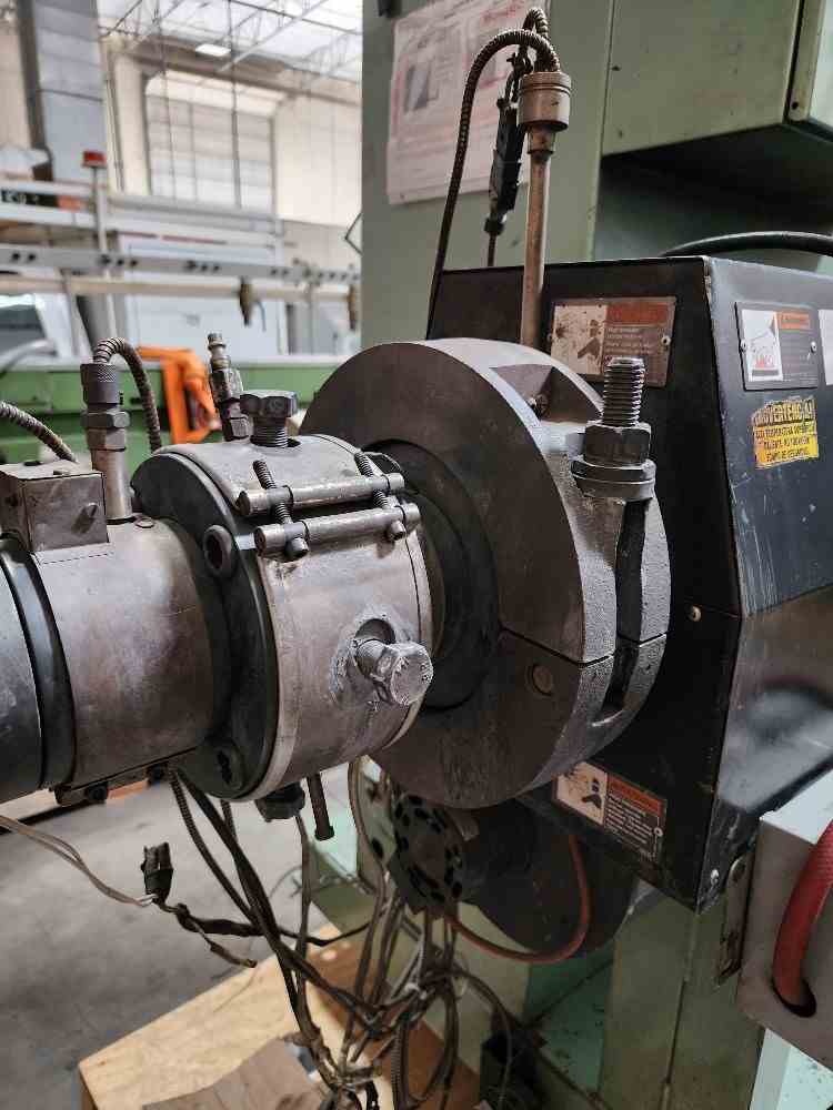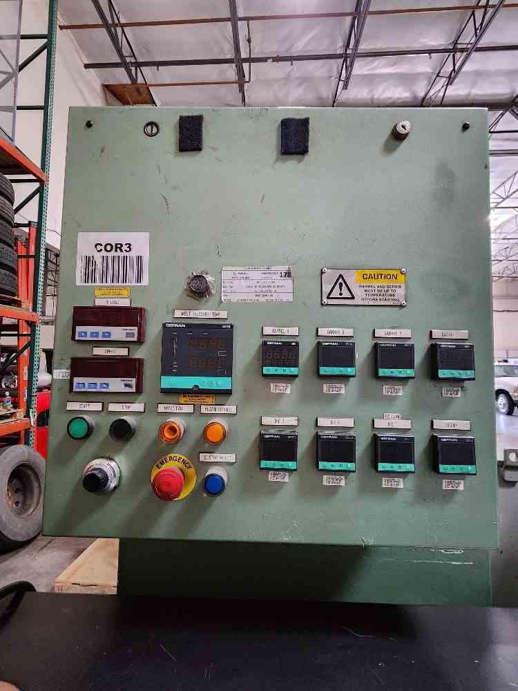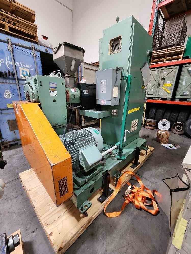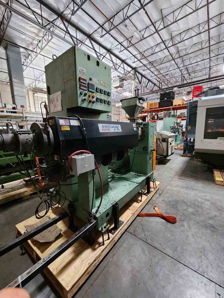 Used 2.5" 24/1 L/D American Kuhne air cooled Extruder. Barrel is standard height 42" centerline. 29kw (40hp) motor and Yaskawa F7 VFD drive. 17.53/1 Kohlmann gearbox rated at 75 hp. Gefren Model 600 temperature controllers. 460 volt AC input. Also see stock # 21661.