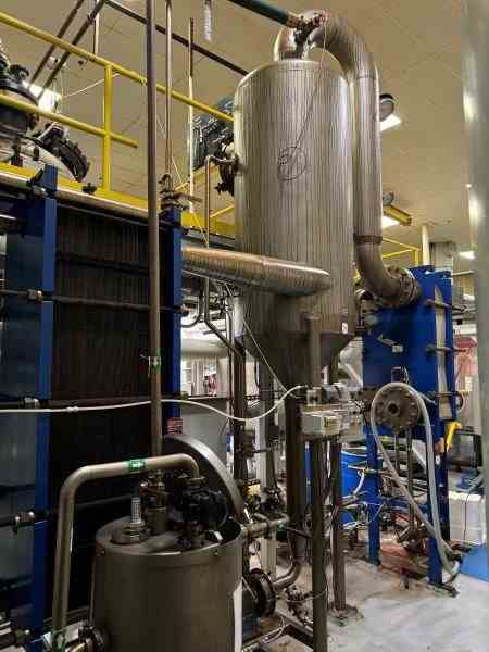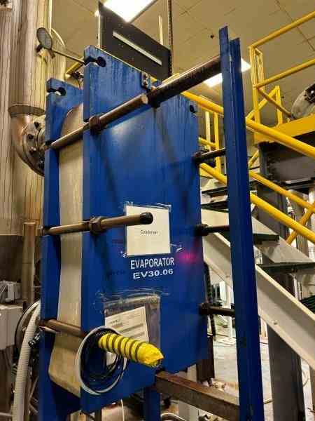 Used Stainless Steel Plate evaporator system. Manufactured by APV. Includes (3) schmidt heat exchangers, separator vessel, vacuum pump, (2) centrifugal pumps. Built 2006.