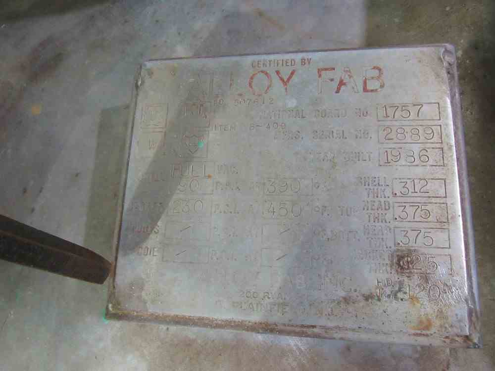 Used 1500 gallon 316L Stainless Steel reactor. Manufactured by Alloy Fab. Internal rated 90PSI/FV at 390F. Jacket rated 230PSI @ 450F. Agitator. Dished heads. Lug mounted. National Board #1757. Serial #2889. Built 1986. Previously used in API facility.