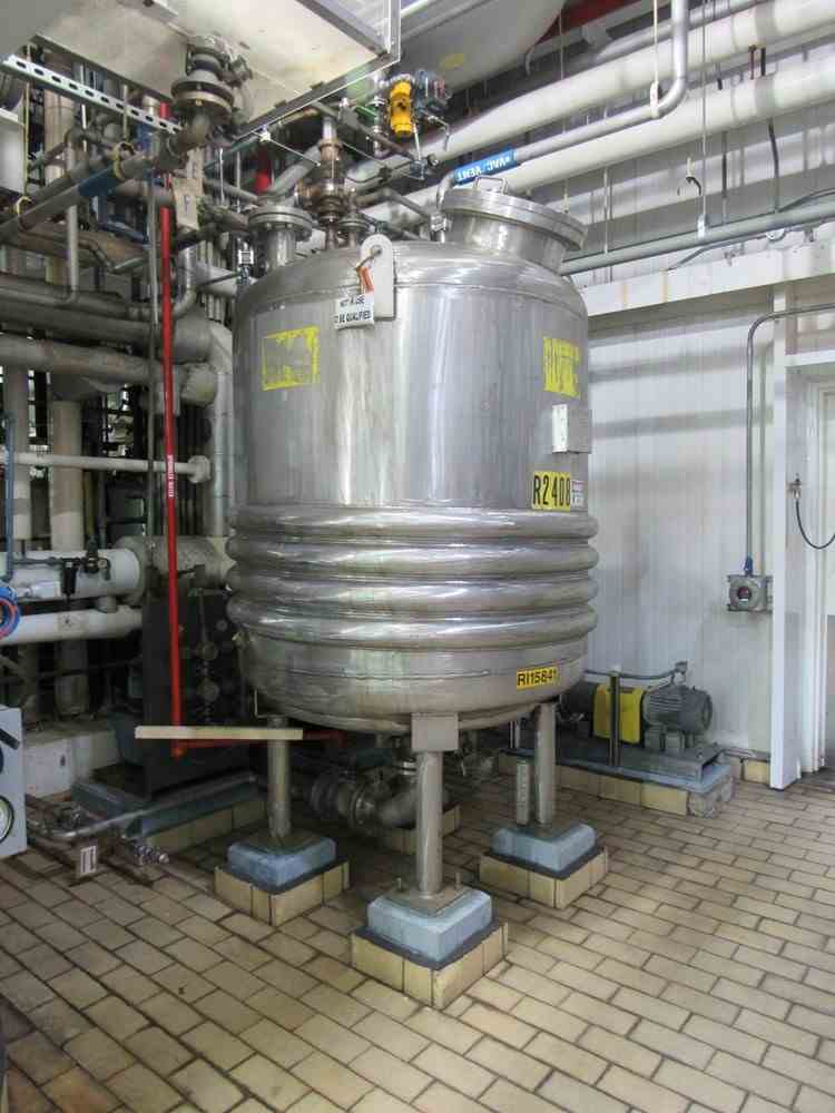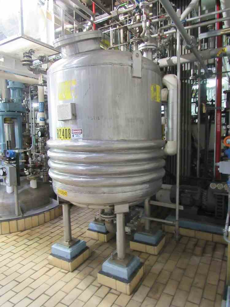 Used 400 gallon 316L Stainless Steel Vertical Jacketed Pressure vessel. Manufactured by Alloy Fab. Shell rated 90psi/fv @390F. Jacket rated 45 psi @390F. Half pipe jacket on bottom half of shell and bottom head. Dished heads. NB #1741. Serial #2943. Built 1986.