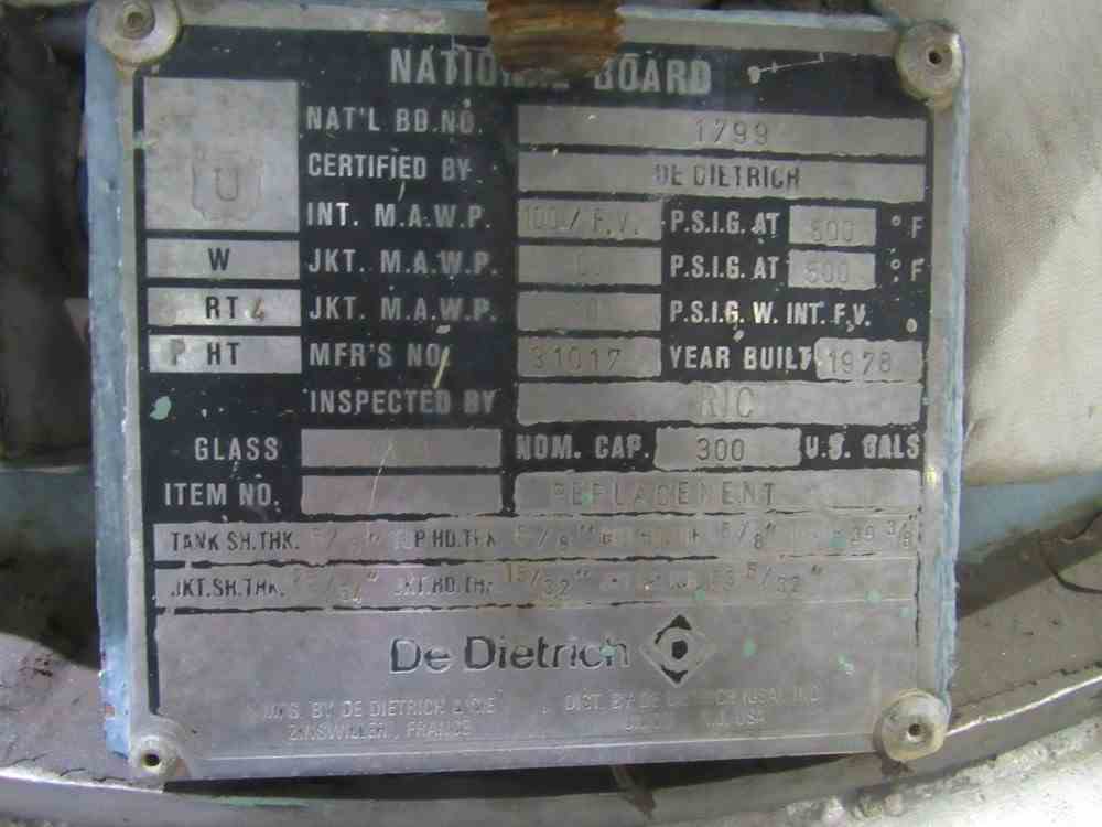 Used 300 gallon glass lined reactor. Manufactured by DeDietrich. Model #CTJ-24-50. Internal rated 100PSI/FV @500F. Jacket rated 100PSI @500F. Agitator. Dished heads. Lug mounted. National Board #1799. Serial #31017. Built 1978.