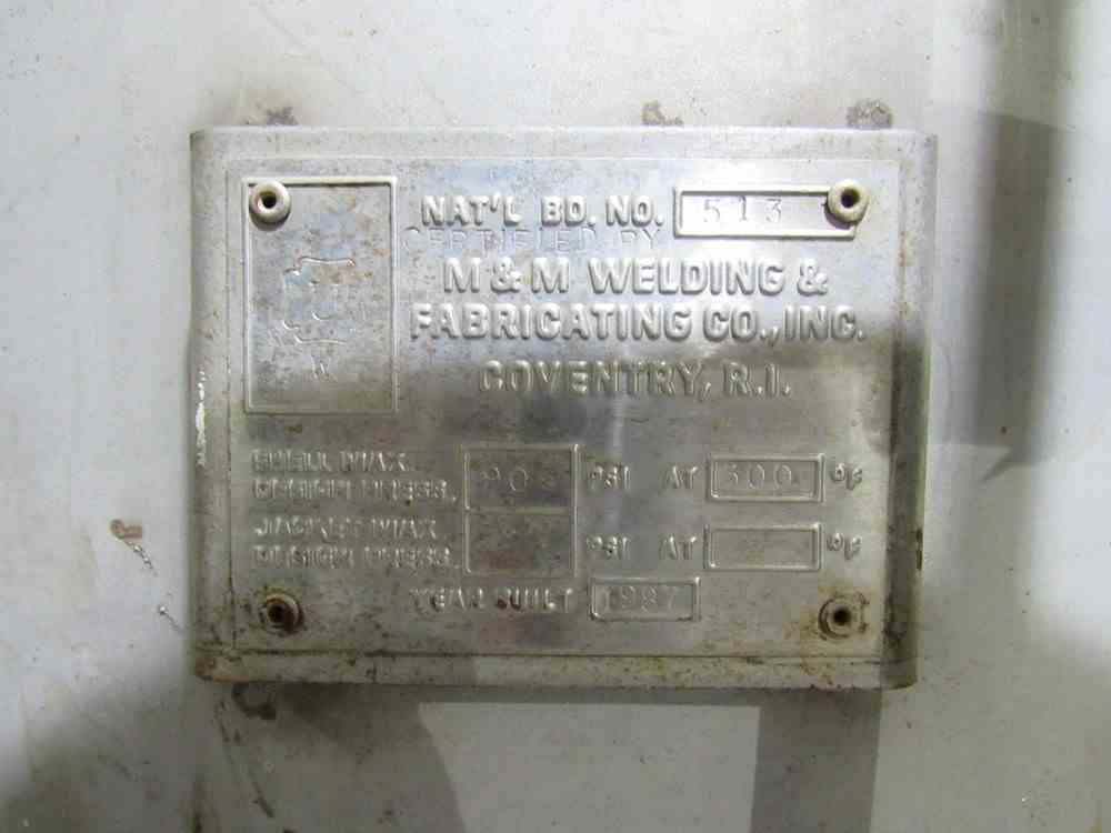 Used 80 gallon 316 Stainless Steel vertical receiver. Manufactured by M&M. rated 90PSI @300F. Flat flange top and dish bottom. Leg mounted. National Board 513. Built 1987. Previously used in API facility.