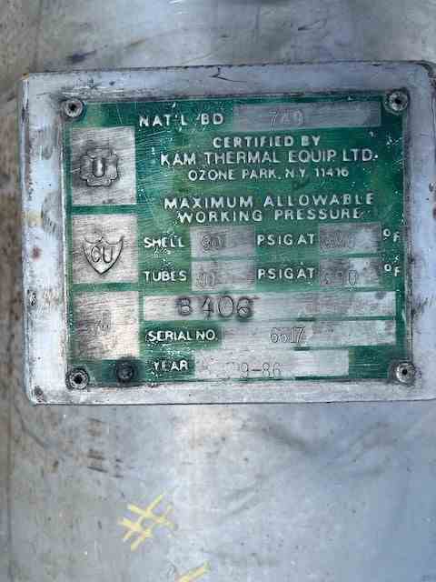 Used 340 Sq Ft 316 Stainless Steel Horizontal Shell and tube heat exchanger. Manufactured by Kam Thermal. 316 SS Shell rated 90 psi @390F. (206) 0.75" 316SS tubes rated 90PSI @390F. Serial #6617. National Board #749. Built 1986.