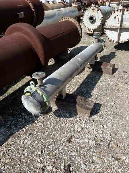 Used 90 Sq Ft 316 Stainless Steel Horizontal Shell and tube heat exchanger. Manufactured by Patterson Kelly. 316SS Shell rated 60 psi/fv #140F. (44) 1" dia 316SS tubes rated 60psi @100F. Serial #210928. National Board coded.