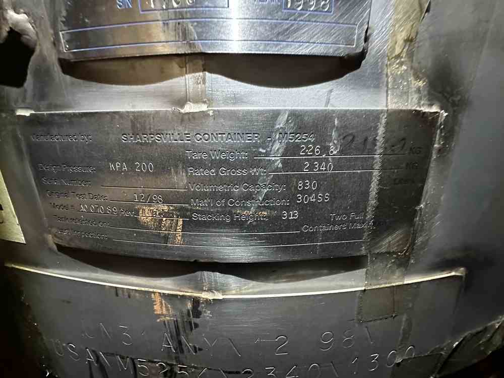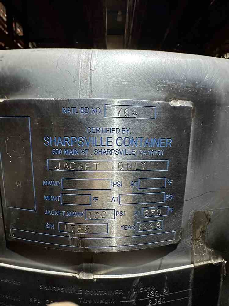 Used 219 gallon (830 liters) 304 Stailess Steel portable tote. Manufactured by Sharpsville Container. Jacket MAWP 100PSI@350F. National Board #768. Serial #1768. Built 1998.