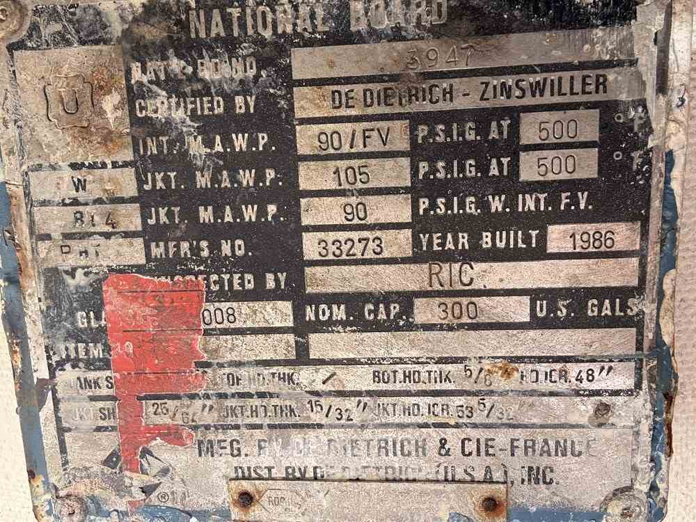 Used 300 gallon Glass Lined Reactor Body. Manufactured by De Deiterich. Glass 3008. Internal 90PSIG/FV@500F. Jacket MAWP 105PSIG@500F. Top mounted agitator with no motor. Serial #33273. National Board #3947. Built 1986.