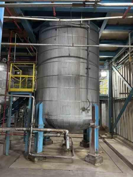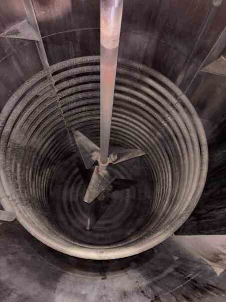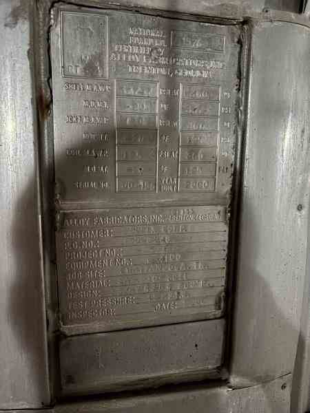 Used 5100 gallon 304 Stainless Steel vertical reactor. Manufactured by Alloy Fab. Internal rated 33PSI@335F. Jacket/Coils rated 125PSI@360F. 7.5 HP agitator. Dished heads. Leg mounted. (4) sidewall baffles. Dims 8'Dia x 12'3"T/T. Weight 9800 lb. Serial #00-155A. Built 2000.