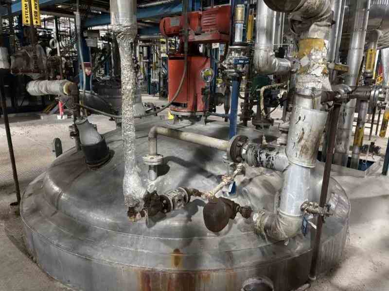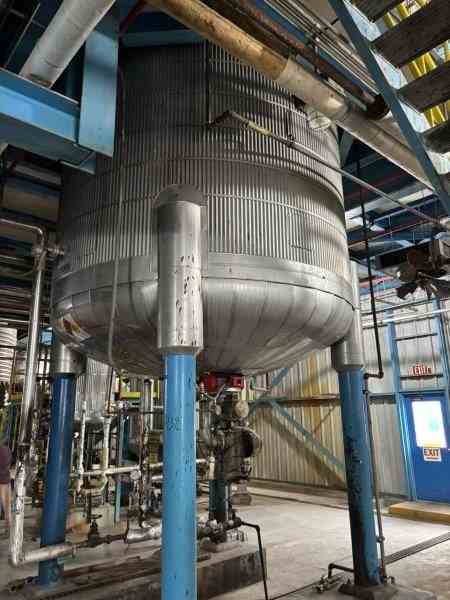 Used 5500 Gallon 304 Stainless Steel jacketed Reactor. Manufactured by Alloy Fabricators. Internal rated 33PSI@335F. Jacket rated 44PSI@335F. Coils rated 85PSI@335F. 5HP agitator. Dished top and bottom. Leg mounted. (4) sidewall baffles. Dims 9'6"Dia x 8'6"T/T. Weight 10300 lb. Serial #1-138A. Built 1991. Past use Cleaning Vessel