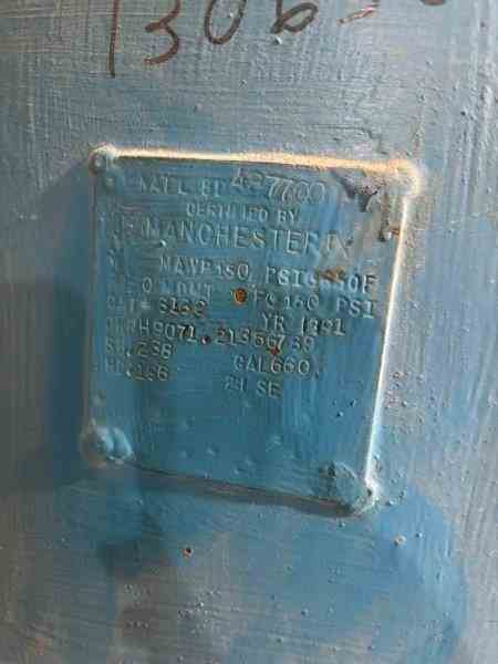 Used 660 gallon Carbon steel pressure vessel. Manufactured by Manchester. 150PSI@250F. Skirt mounted. Dished heads. National Board #487700. Built 1991.