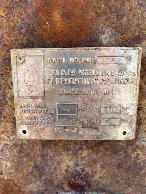 Used 1200 gallon vertical 304 stainless steel pressure vessel. Manufactured by M&M Welding. Rated 90 psi @300F. Dished heads. .500" thick. On leg supports. Openings: Top 20" manway, Bottom 4" CBO. Serial #537. National board #379. Built 1984.