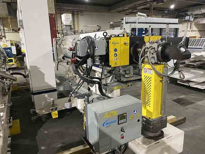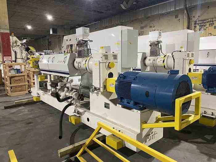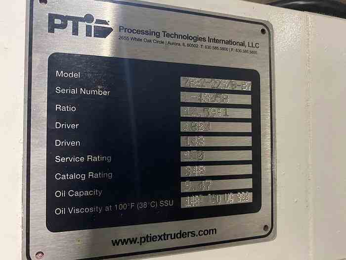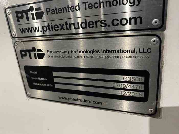 Used 3.5"Dia Single Screw Extruder. Made by Processing Technologies International LLC. Model G3500. Trident Series. L/D ratio 32:1. Gear Drive: PTI Model ZPE2-225-B B7. Serial #L43058. Ratio 12.59:1. Driver:1800. Driven:143. Service Rating: 150. Catalog Rating: 348. 150 HP 3-60-460 motor. ABB ACS-880 VFD. (5) zones - water cooled. 164.16" screw length. Screen changer assembly. PTI electrical enclosure panel. Serial #16709-4478. Built 2015. Dimensions: 23'-4" long X 6'-4" wide X 8' tall.