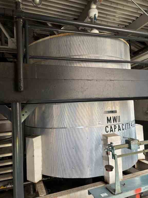 Used 4300 gallon stainless steel tank. Dims 102"D x 108"Straight side. Flat top, cone bottom. Leg mounted.