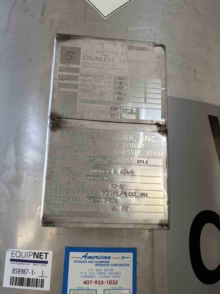 Used 2000 gallon 304 stainless steel vertical pressure vessel. Manufactured by Stainless Tank, Inc. MAWP 50PSI@150F. Dims 60"Dia x 216"Straight side. Dish top and bottom with sloped grate. Side bottom manway. Serial #12-146-4. National Board #345. Built 2013.