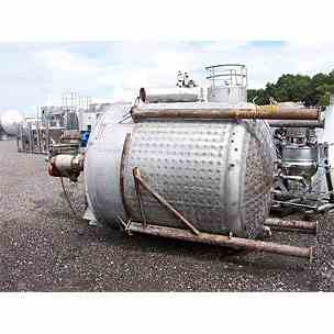 Used approximately 1200 gallon vertical stainless steel dimple jacketed tank. 70" diameter X 72" hjgh straight side. Open top. Dished bottom with 2" center bottom drain. Equipped with top bridge mounted agitator. 3HP Reliance motor with reeves drive gear ratio 25.6 : 1. Max. output 166 - Min output 16.6. (2) blade agitator bottom blades equipped with bottom scrapers. Top blades flight style covering entire diameter of tank. Mounted on legs.