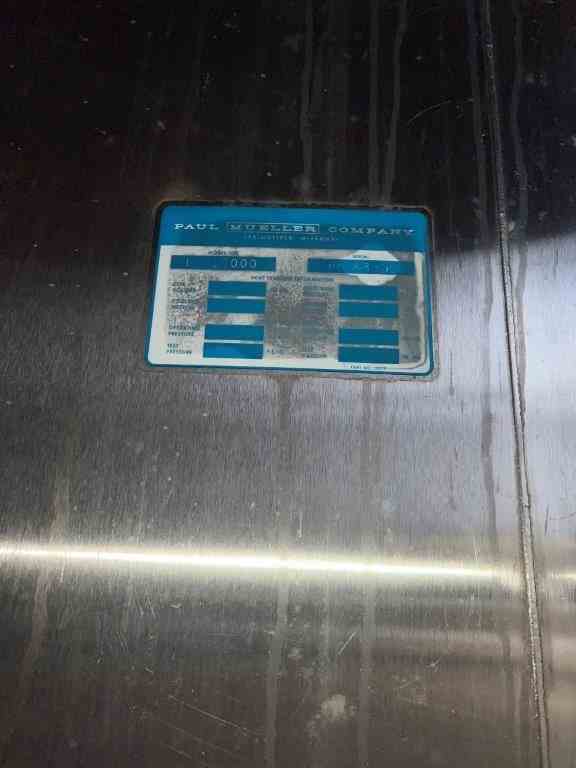 Used 15900 gallon 304 stainless steel tank. Manufactured by Paul Mueller Co. ATM@212F. Dish top and bottom. CIP Spray ball, top manway. Skirt mounted. 144"D x 204" Straight side.