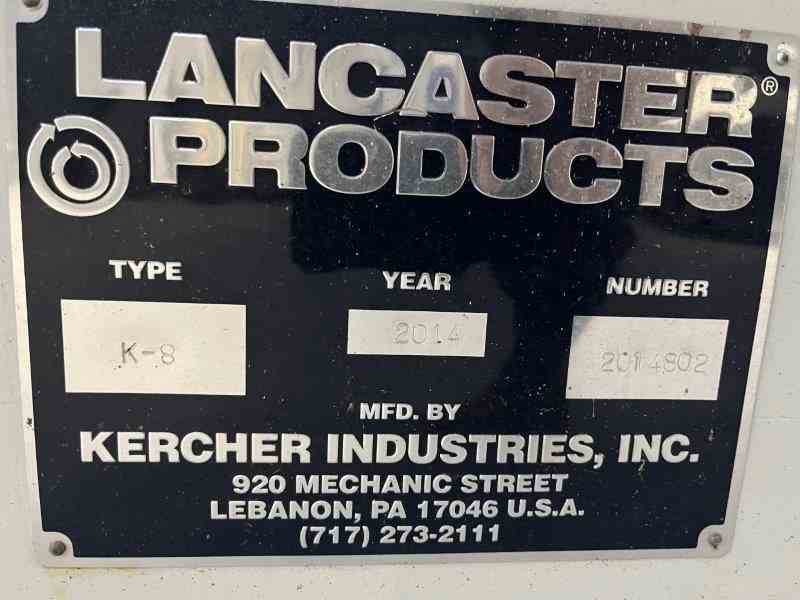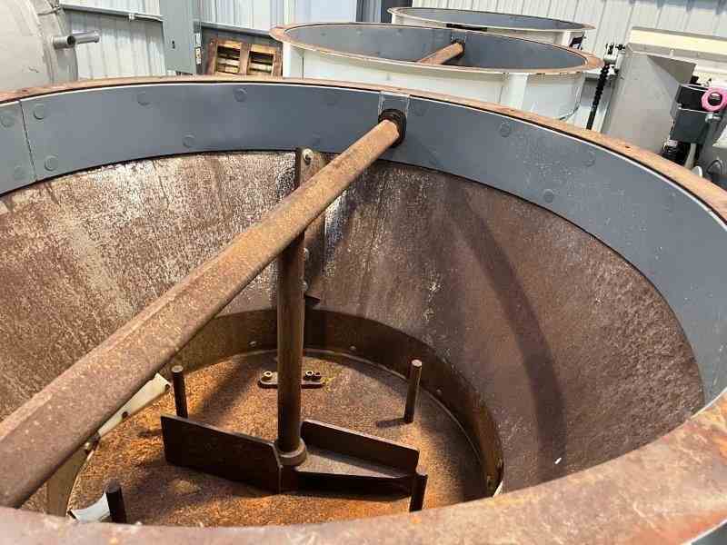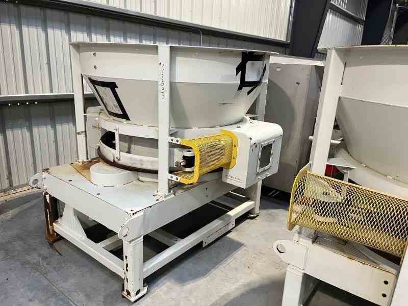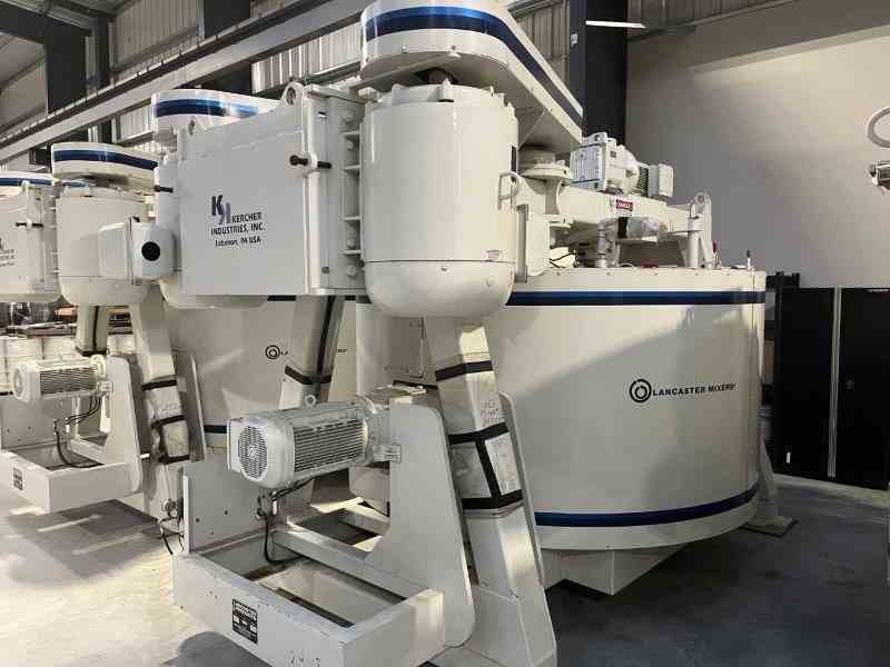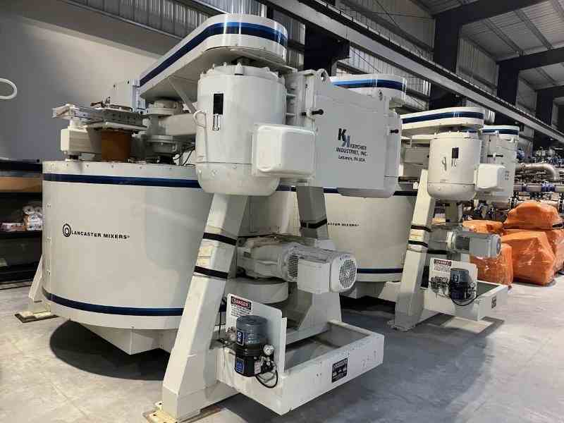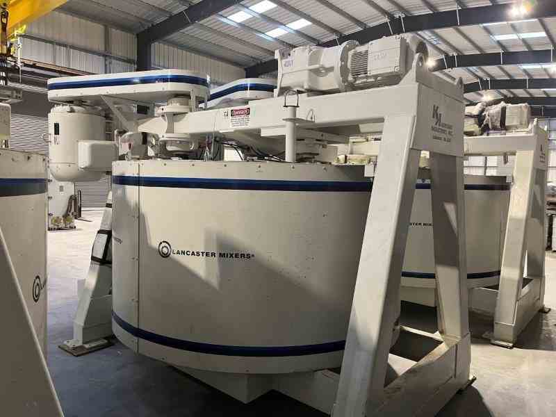 Unused 125 HP High Intensity Mixer. Manufactured by Lancaster. Model K-8. 9'7 3/8" Height x 13'6" Length x 8'9 1/2" Wide. Dual Rotor High Intensity Mixer Type. 3000 liters maximum batch capacity. 1680 kg of damp sulfur mix at a nominal loose bulk density of 560 kg/m3. 105 Cubic Feet Maximum Mixer Working Capacity, 10,500 lbs (Material Density of 100 lbs/cuft). Carbon Steel with a 316 Stainless Steel Liner. (2) 125 HP, 575 Vac./ 3 ph./ 60 Hz. High Speed Rotor Drive (Belt Drive). 30 HP, 575 Vac./ 3 ph./ 60 hz. Mixing Pan Drive (Gear Type). 30 HP, 575 Vac./ 3 ph. / 60 hz. Plow Drive (Gear Type). Bottom Hydraulically Operated Pan Discharge Valve. Rotating pan and a counterclockwise rotating mixing plow. Three-dimensional macro mixing streams, two stationary side scrapers into the two counterclockwise rotors for high-intensity mixing. Includes Lancaster 60" Rotary Table Feeder. 105 Cubic Feet Working Capacity. 12.5 HP Motor. All built in 2014.