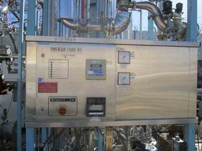Used 1240 kg/hr 316L Stainless Steel Pure Steam Generator. Manufactured by Finn-Aqua. Model 1500-S1. Rated 1240 kg/hr @116PSI. 80HP motor. 350 gal/min to 2730 lb/hr. Uses 3258 lb/hr plant steam. includes feedpump and controls. Serial #37889. Built 1993.