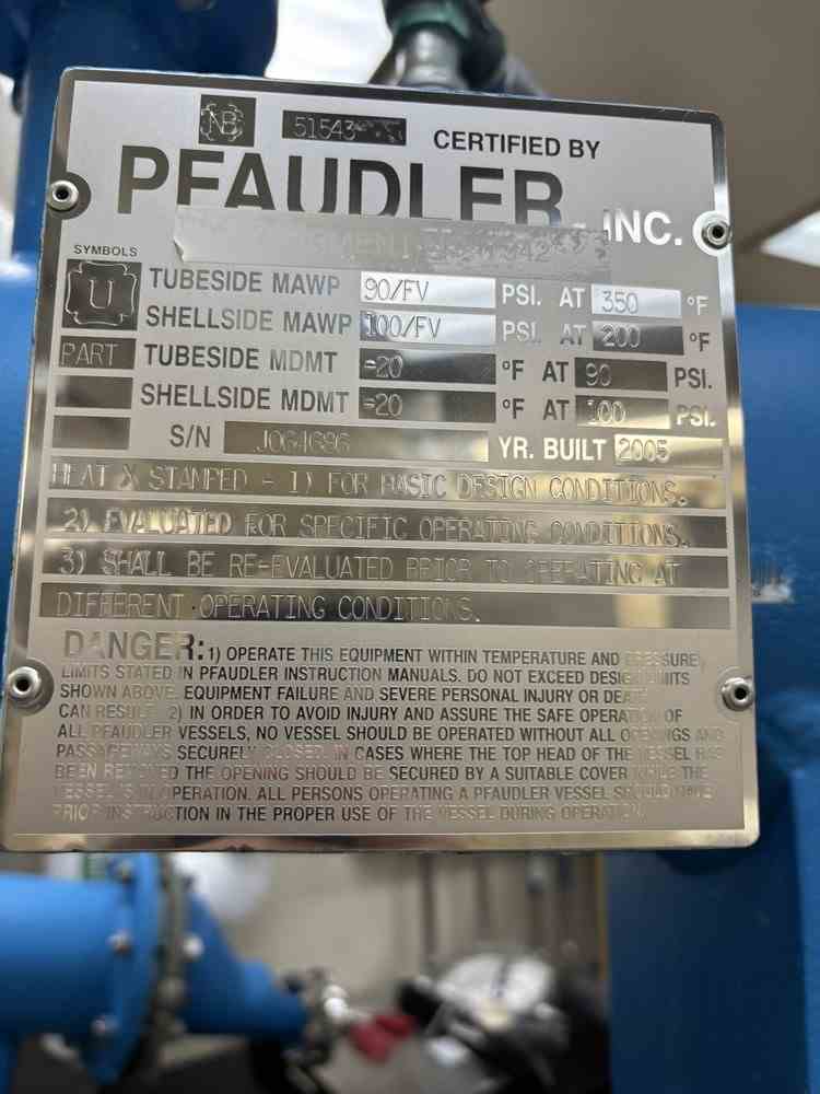 Used 26 Sq ft Tantalum condenser. Manufactured by Pfaudler. Type 08-060-BEM-26. 8"D x 60"L tubes. Tantalum 2-1/2% Tungsten Alloy Tubes rated 90PSIG/FV@350F. CS Shell 100PSIG/FV@200F. Serial #J064686. National Board #51543. Built 2005.