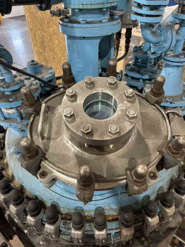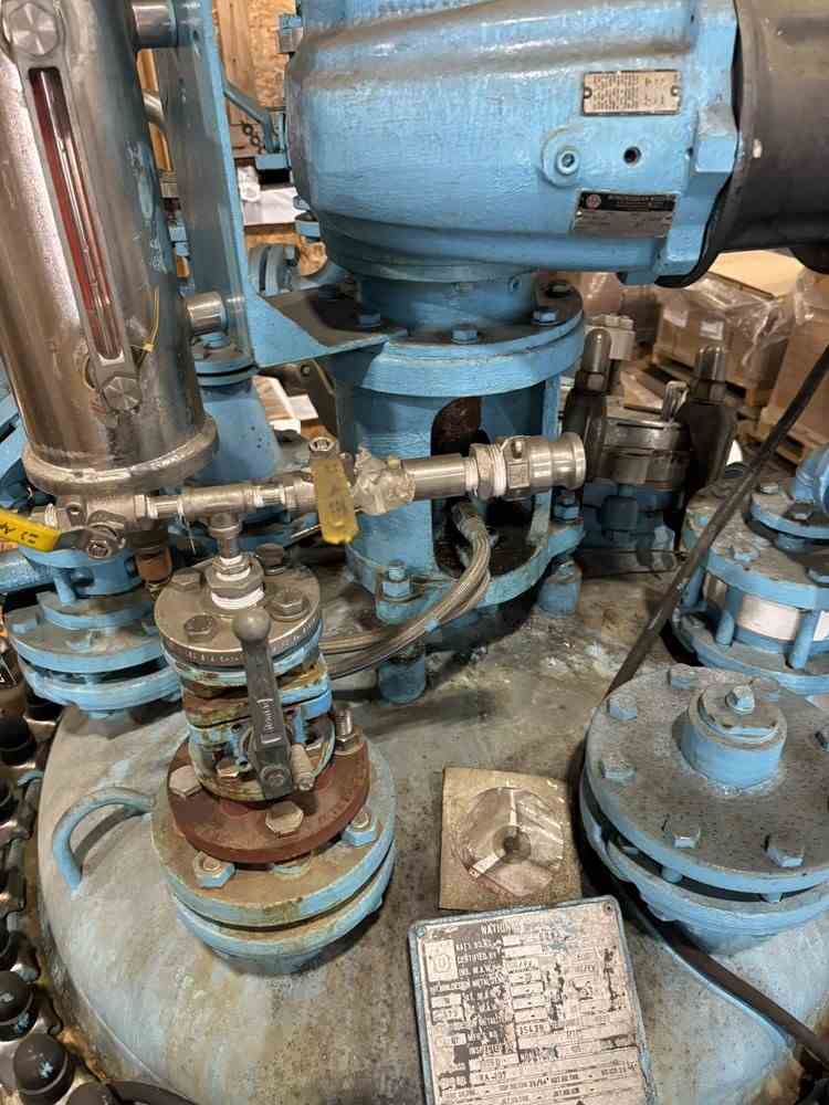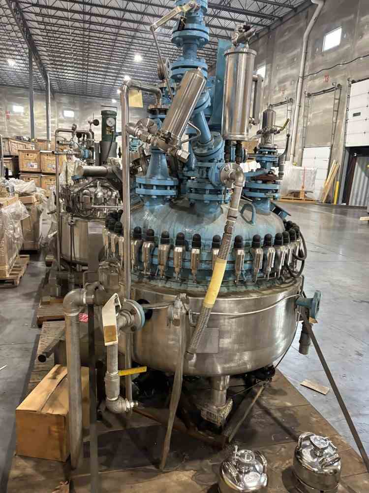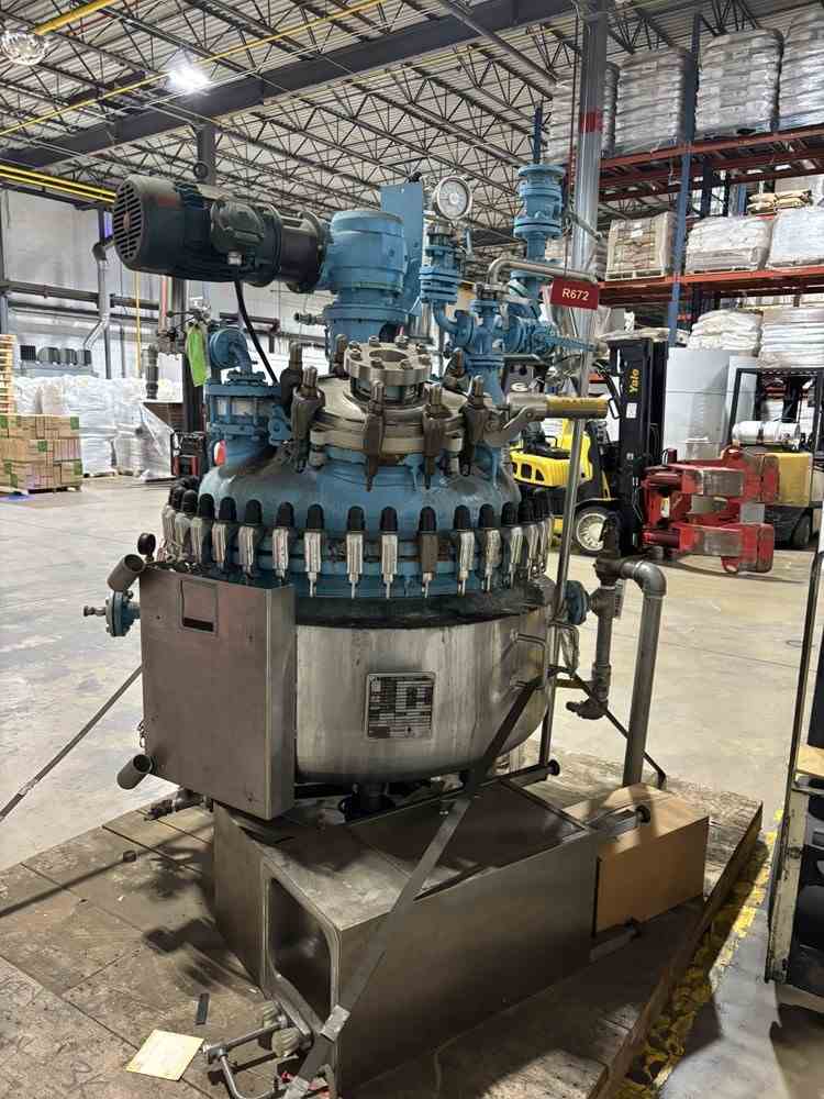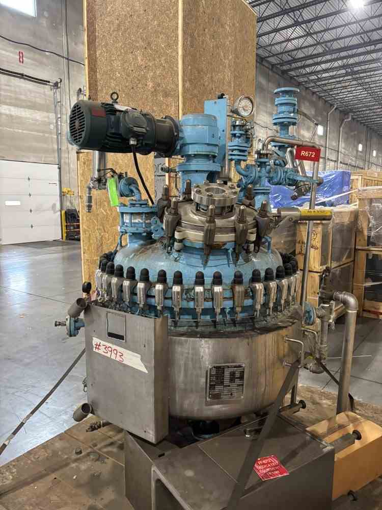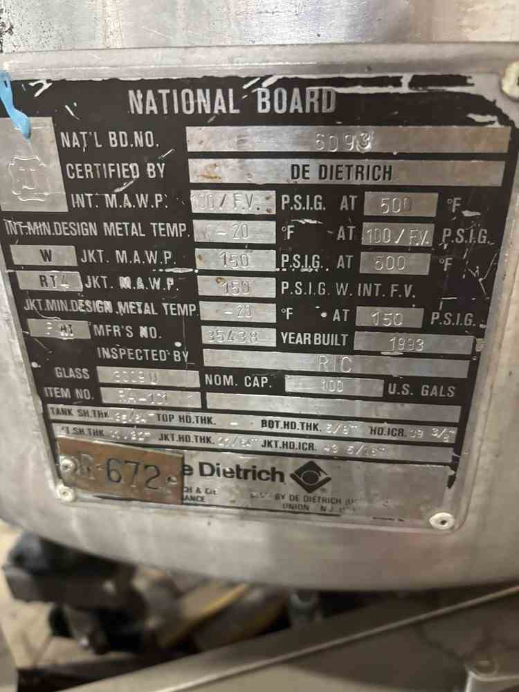 Used 100 gallon glass lined reactor. Manufactured by DeDietrich. Model CTJ-100. Glass 3009U. MAWP 100PSIG/FV@500F. Jacket MAWP 150PSIG@500F. 5hp top entering agitator. (4) Leg mounted. Clamp on dome top, dish bottom. Mounted on (4) legs with casters. Serial #35438. National Board #6093. Built 1993. Crystallizer R672