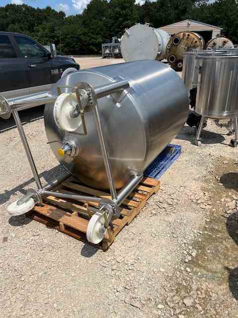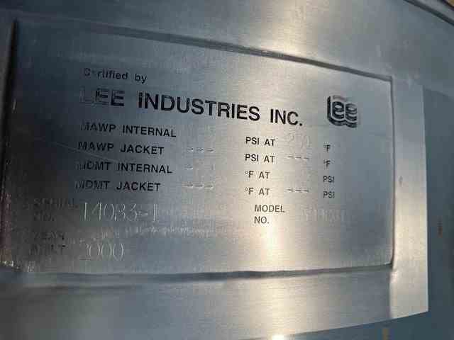 Used 500 gallon Sanitary Stainless Steel Pressure Vessel, Mfg. by Lee. 4'0" diameter x 5'0" length. Vertical. Model 500CBT. Mawp 5 psi @ 250 F.Serial #883-1(?) Built 2000.