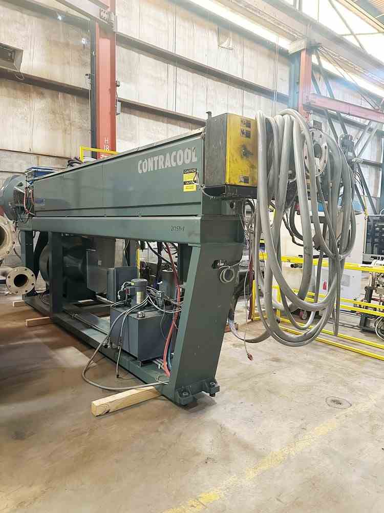 Downstream of the line includes a 56" x 18" x 24" inclined chill roll stack with polished chrome rolls, hydraulically loaded and includes individual roll drives. Includes 4-zone "Green Box" pumping package for primary roll cooling and secondary roll cooling. New 2016. Spare 24" OD matte finish roll for center position on stack.