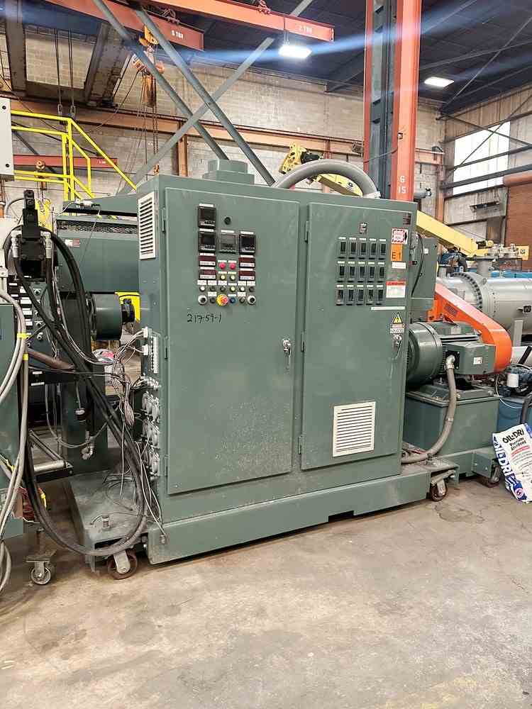 -6" Battenfeld Gloucester 30/1 L/D extruder driven by 500 hp AC motor with Yaskawa VFD control. New 2006. Extruder: 77" centerline height, 460 volt AC input, Contra Cool design including blower, 7" x 12" feed throat dimension with standard hopper and air actuated slide gate, and 16.07/1 gearbox ratio. Barrel vented and plugged