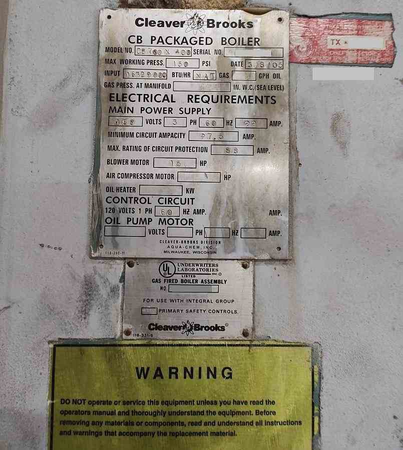 Used 400HP Packaged boiler. Manufactured by Cleaver Brooks. Model CB700x400. Max working pressure: 150 PSI. Natural Gas. Input: 16329000 BTU/HR. 15HP blower motor. Controls. Gas Train. Serial #L94260. Built 2005. Includes De-Aerator Tank, Water Softener & Feed Pumps. Overall Dimensions: 210'L x 123"W x 126"H Shipping Weight: 36,500 lbs