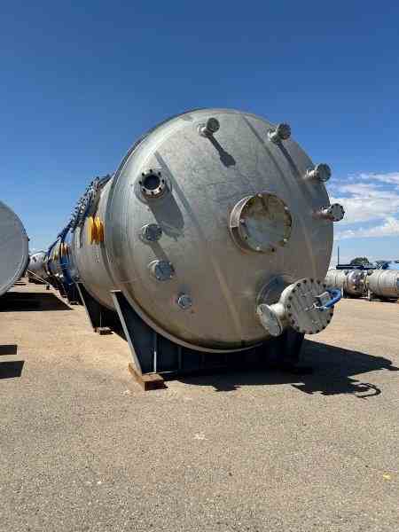 Unused 19570 gallon 304L Stainless Steel Vertical mixing vessel. Manufactured by Equipmex (Mexico). Internal rated 50PSI/FV@306F. Coils rated 17PSI@380F. 3HP agitator: Chemineer Model #22GTN-3, 1200 rpm input, 30 rpm output, 230/460 volts. Dims: 12'6" OD x 17'9" T/T. Dished top and bottom. 24" manway with davit. 14' skirt mounted. Empty weight 45291 lb. National Board coded. Built 2022.