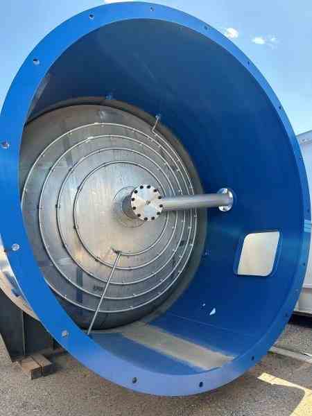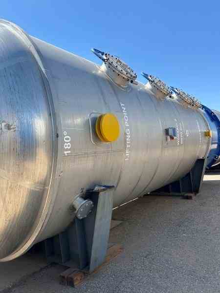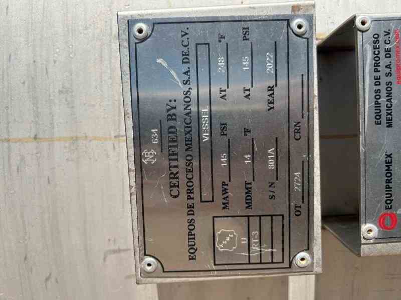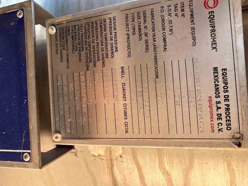 Unused 20870 gallon 316 Stainless steel vertical tank. Manufactured by Equipromex (Mexico). Internal rated ATM@ 248F. 304 SS Coil rated 87PSI/FV@380F. 11'6"ID x 23'6"T/T. Agitator: Mfg. by Chemineer Model #23GTN-7.5, 7.5 hp, 1800 rpm input, 16.5 rpm output, 230/460 volts. Dished head and bottom. 24" manway with davit arm. Skirt mounted. 21318 lbs weight. Built 2022. Designed as Acid Reactor.