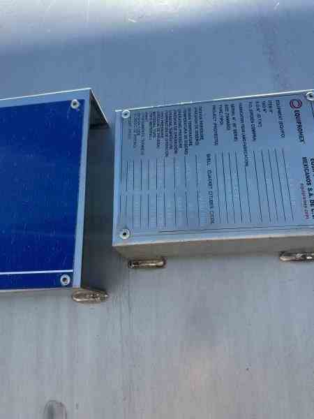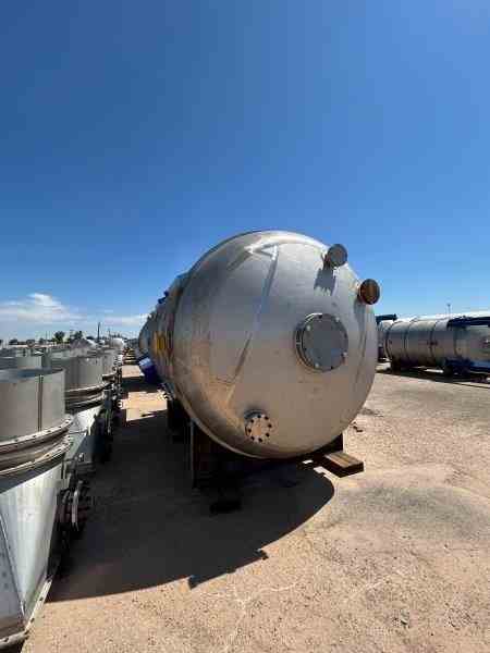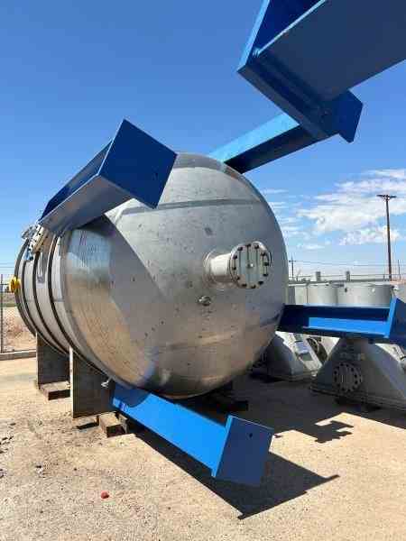 Unused 8901 gallon 304L Stainless steel vertical tank. Manufactured by Equipromex (Mexico). Internal rated ATM@306F. 316L SS Coil rated 87PSI/FV@380. Dims 10'OD x 12' T/T. Chemineer Agitator Model #12MRA-3, 3 hp, 1800 rpm input, 45 rpm output, 230/460 volts. Dished head and bottom. Leg mounted. 24" Manway with davit. 12768 lbs weight. Built 2022. Designed as Silica Reactor.