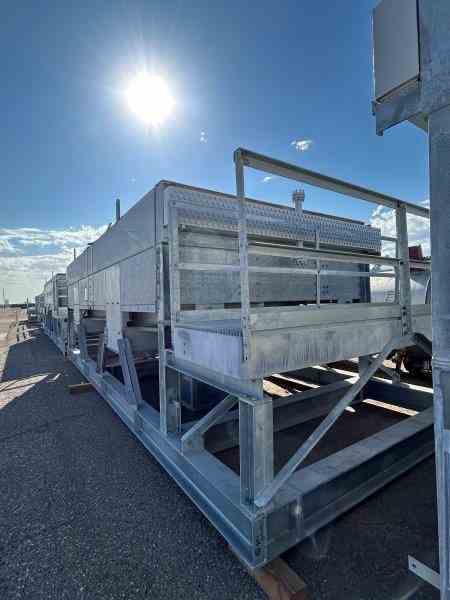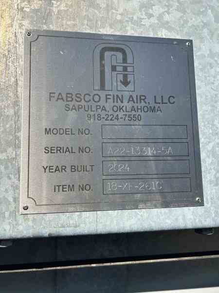 Unused 48027 sq ft Carbon Steel fin fan heat exchanger. Manufactured by Fabsco. 41.1 MMBTU/hr design duty. 2287 bare sq.ft. 26'0" tube length. Rated 135psi/FV @300F. (2) 25 hp fans. 336-1"od x .083"mw. (2)4" inlets and (2) 4" outlets. Dimensions: 31'0" l x 12'4" w x 10'3" h (with Platform), 40,000 lbs weight. Designed as Lean Amine Coolers. Under Nitrogen Purge. Built 2024.