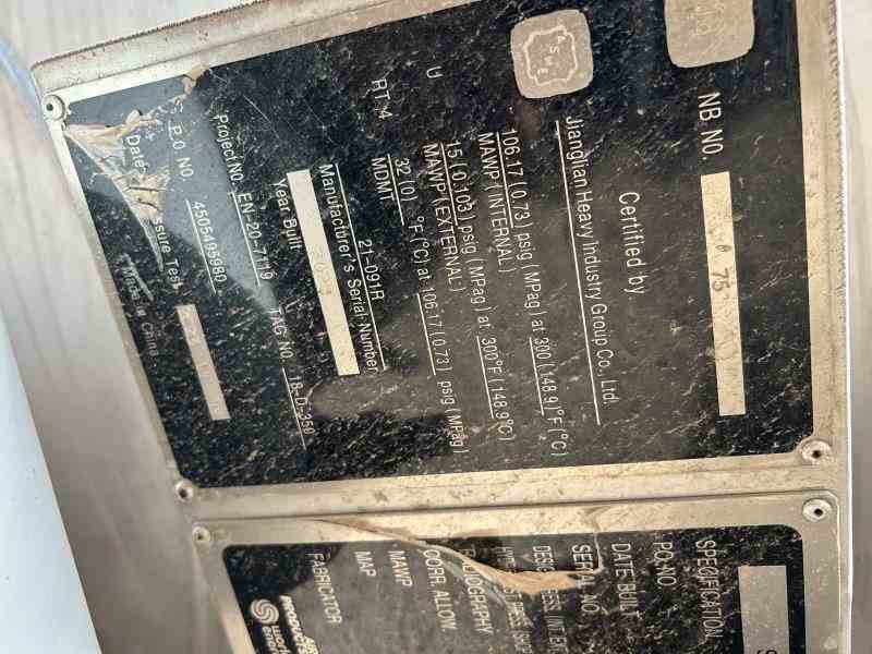 Unused 3500 gallon 316L Stainless Steel Vertical pressure vessel. Built by Jianglian Heavy Industry Group Co., Ltd. Internal design rated 106PSI/FV@300F. 6'ID x 16'6" T/T. National Board #75. Serial #21-091R. Skirt mounted. Built 2023.