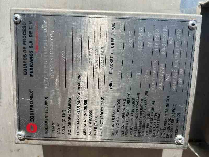 Unused 3200 gallon 304 Stainless Steel vertical tank. Built by Equipromex. ATM@250F. 316 SS Coil rated 87/FV@350F. Cone bottom. Leg mounted. Built 2022.