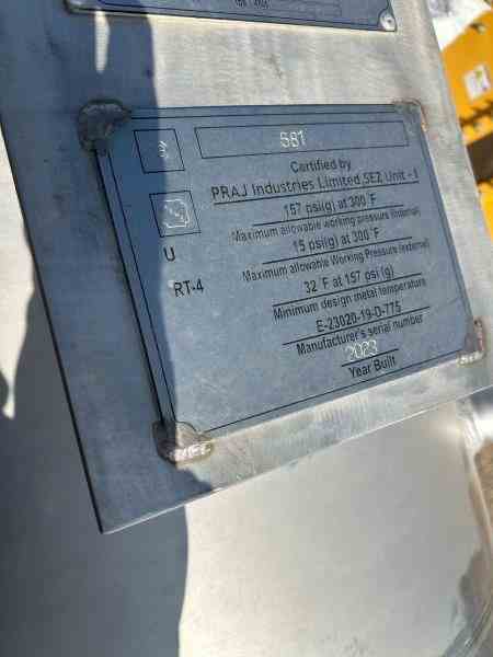 Unused 561 gallon SA-240-304L Stainless steel vertical pressure vessel. Manufactured by Praj (India). Internal rated 157PSI/FV @300F. 3'0"ID x 10'3"T/T. Flanged dished head and bottom. Skirt mounted. 4,860 lbs weight. Built 2023. NB #581, Serial #E23020-19D775. Designed as Vent Gas KO Drum.