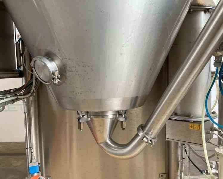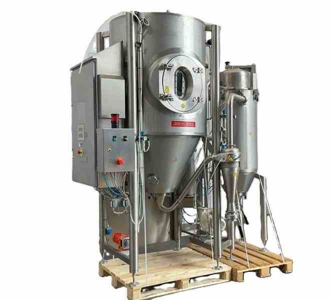 Used 35.4" Dia Stainless Steel Spray Dryer. Manufactured by Anhydro. Model CH-63 ATEX. 900 mm (35.4") dia drying tower with 39.4" cylindrical height and 23.6" conical height. Outlet diameter 100 mm (3.9"). Evaporation capacity up to 13 kg/hr (water). Air heating via 15 kW electric system. Fan motor 0.7 kW, 400V, with an additional 1.1 kW motor. Atomization available via both rotary atomiser (63 mm) and nozzle atomiser options. Includes drying tower mounted on frame, cyclone separator (Ø 200 × 600 mm / 7.9" × 23.6"), dust filter with air-pulse cleaning, and fan system. With switchgear and CE certification. explosion panel with flame arrestor, includes 15 litre liquid dosing vessel, siemens S7 control panel plc and HMI. Floor footprint 2.5 × 2.2 m. Built 2010.