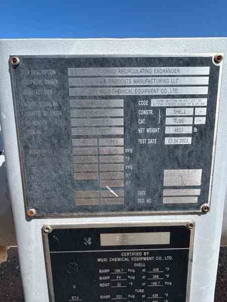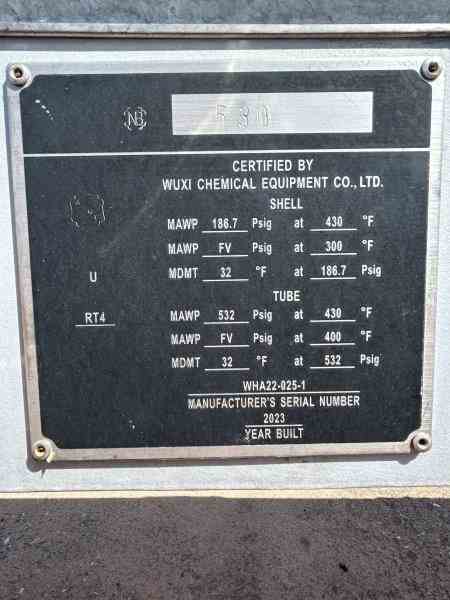 Unused 234 sq. ft. 2205 Duplex SS horizontal shell and tube heat exchanger. Mfg. by Wuxi Chemical Equipment 2023. 3.6 Design duty (MMBTU/Hr). Shell Design Rating: 180/FV psig @ 430/300 deg. F. Tube Design Rating: 232/FV psig @ 430/400 deg. F. Shell mawp 186.7/FV psig. Tube mawp 532/FV psig. 15.5" 108". Serial #WHA22-025-1. National Board #530. Recirculating exchanger. Under Nitrogen Purged.